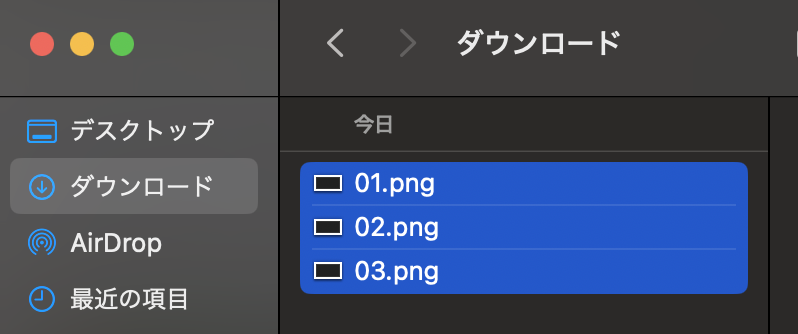 Finderを開き、リサイズしたい画像を複数選択します。選択するには、CommandキーもしくはShiftキーを押しながら画像をクリックしてください。
