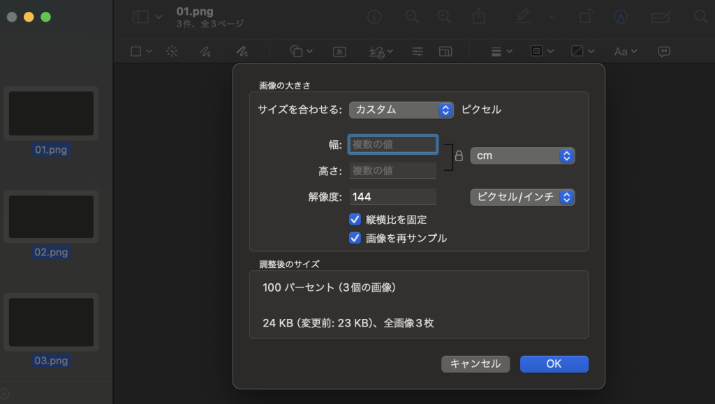 サイズを設定し、「OK」をクリックすると、すべての選択された画像にリサイズが適用されます。その後、Command + Sキーで変更を保存してください。